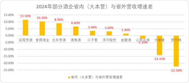 以地域属性较强的 10 家次高端中端酒企为例,2024 年有 7 家省内营收增速远高于省外广域渠道的增速。