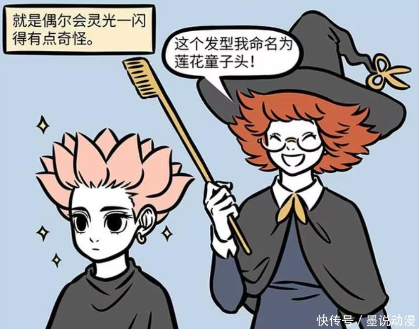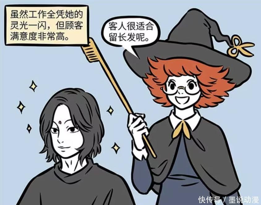 《非人哉》漫画中,女巫可以说是很厉害的发型师,在她登场到现在,一共改变过6人的发型,他们分别是杨戬、观音、哪吒、托尼老师、精卫和石狮子,其中精卫换了4款发型。不过女巫也有束手无策之人,李靖曾经找过她同翔网,但最终还是没能改变一直秃头的命运。