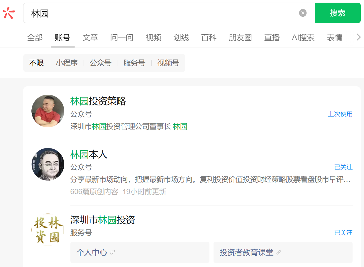 不过,记者在微信平台上搜索“林园”时发现,依旧存在“林园投资策略”“林园本人”等号称林园的自媒体账号。这类账号常常发布股市行情点评,并借助文章、私信等进行引流和荐股,部分高仿号的显示排名甚至在官方公众号“深圳市林园投资”之上。