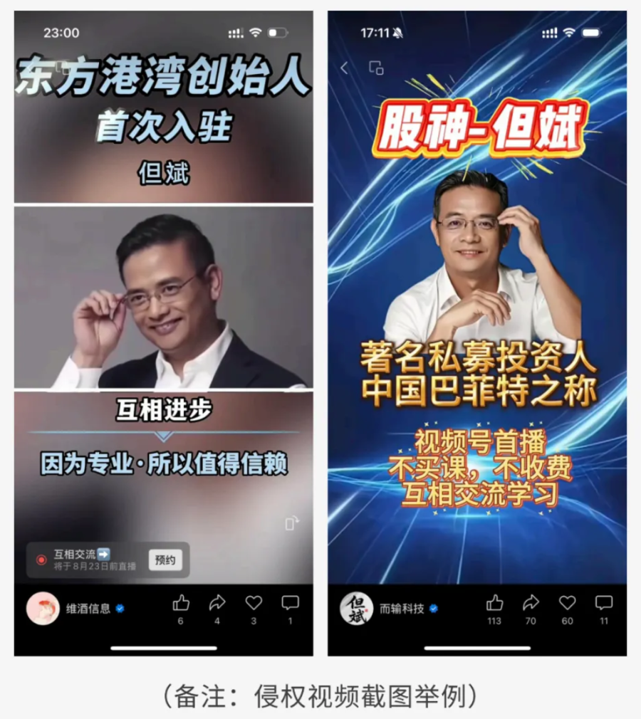 8月18日,东方港湾发布公告称,近日公司发现互联网平台上有不少新注册的账号,利用AI技术生成但斌的图片或视频,或生成“但斌投资股东大会”的图片,标榜“不卖课、不收费”或“共同学习、共同进步”等从事非法荐股活动。